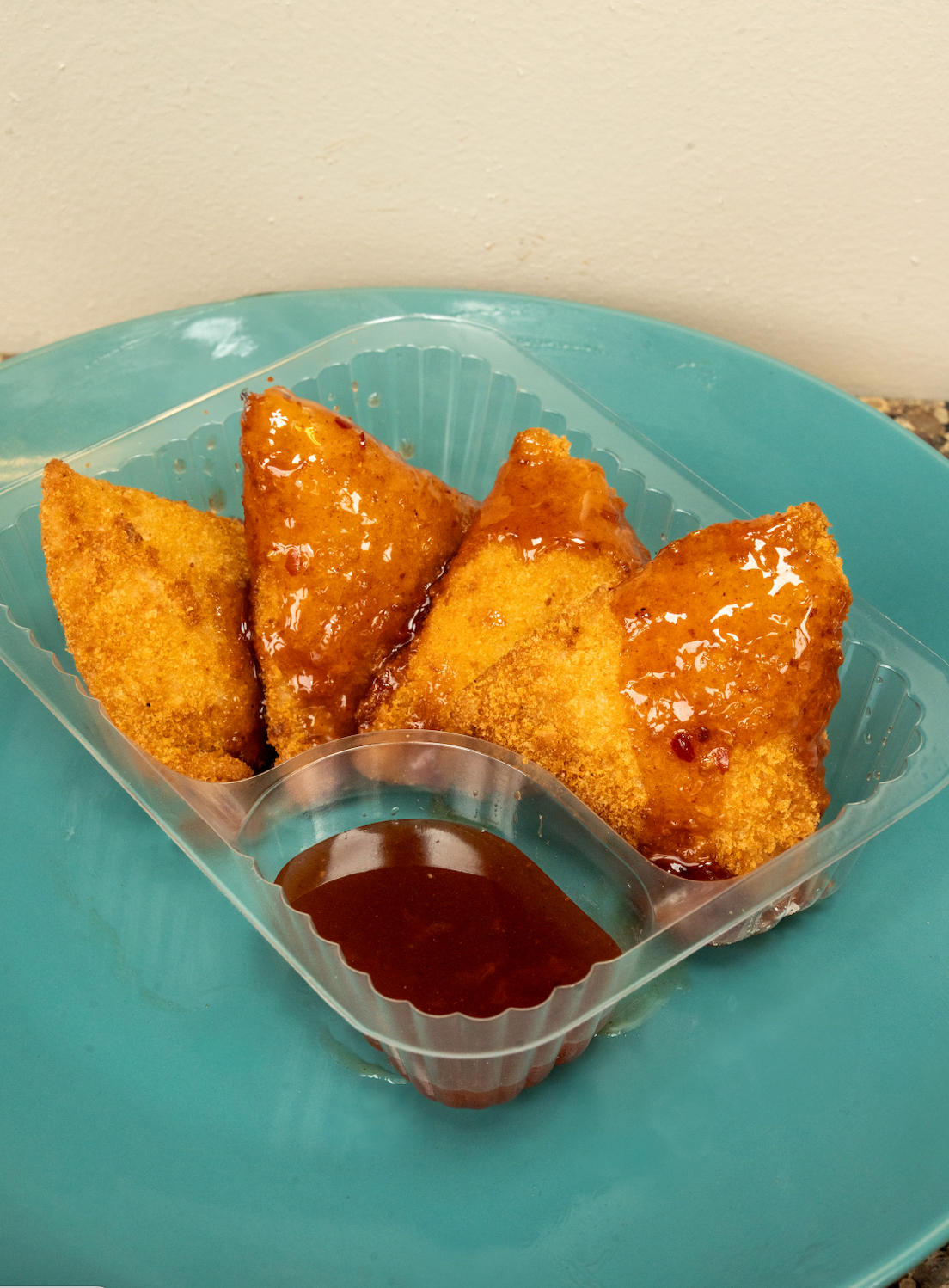 Creamy Pimento Cheese: mayo, cheddar cheese and pimento peppers, all wrapped in a deep fried deliciousness. Served with a raspberry pepper dipping sauce.