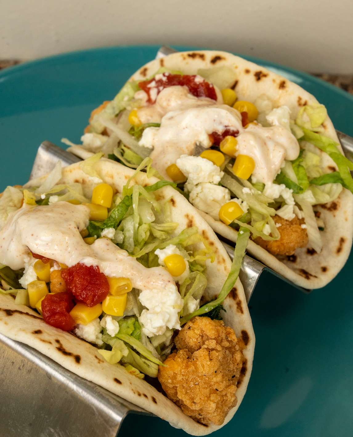 A family and fan favorite. Crispy fried and seasoned popcorn chicken, elote corn, tomato and lettuce. So good~